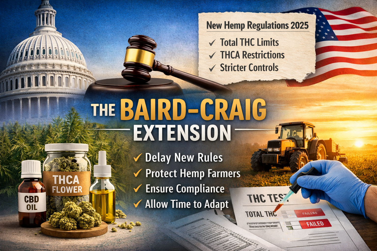 The 2025 federal funding bill introduced stricter hemp language that reshapes how THCA and delta-9 are treated at the federal level. The Baird–Craig extension is fundamentally about stability and implementation runway—so compliance can become consistent, science-based, and enforceable without collapsing legitimate hemp activity overnight.